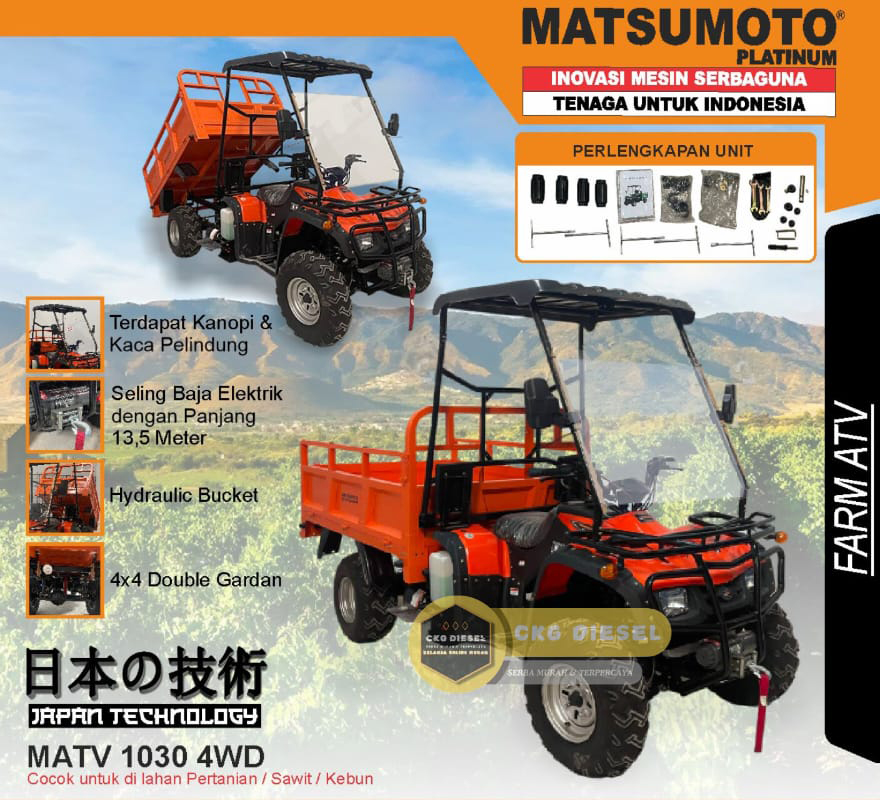 Matsumoto MATV 1030 4WD adalah kendaraan angkut serbaguna yang dirancang khusus untuk medan berat seperti lahan pertanian, perkebunan sawit, dan area perkebunan lainnya. Mengusung “Japan Technology”, kendaraan ini mengombinasikan tenaga mesin 300cc yang tangguh dengan sistem penggerak roda 4×4 (Double Gardan) untuk memastikan performa maksimal di jalur berlumpur maupun tanjakan terjal.