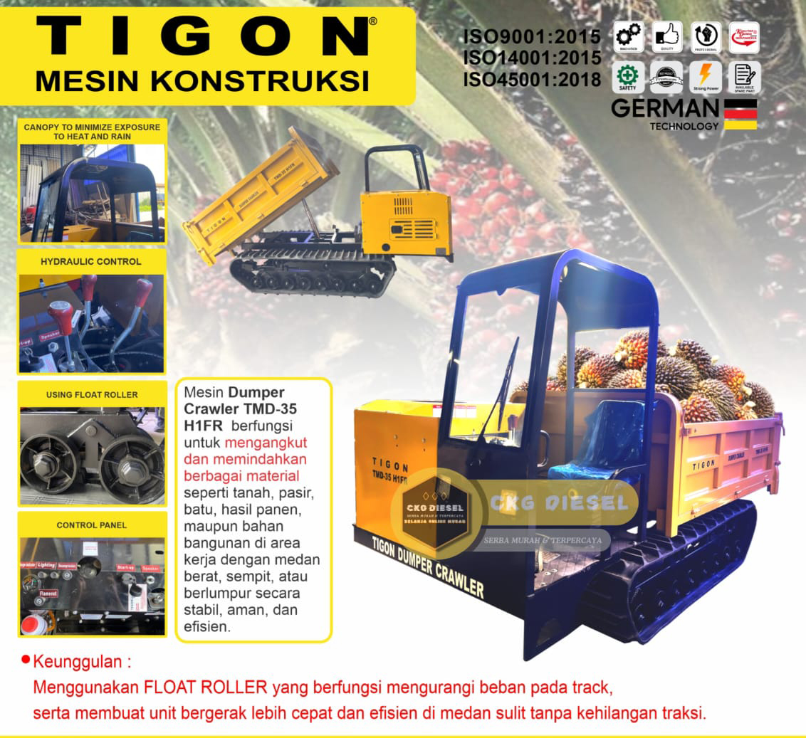 Tigon TMD-35 H1FR adalah mesin dumper crawler (roda rantai) berperforma tinggi yang dirancang untuk mengangkut dan memindahkan berbagai material seperti tanah, pasir, batu, hasil panen (sawit), maupun bahan bangunan. Mengusung “German Technology”, alat ini sangat efektif digunakan di area kerja dengan medan berat, sempit, atau berlumpur secara stabil, aman, dan efisien.